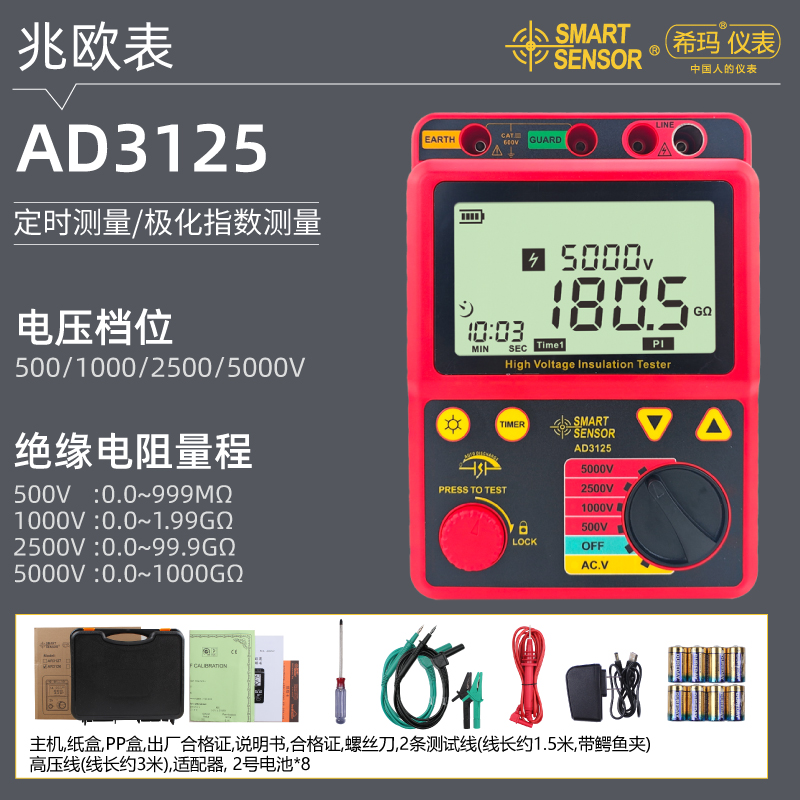 5檔量程的高壓絕緣電阻表 試驗電壓:250/ 500/ 1k/ 2.5k/ 5kV 泄漏電流、電...