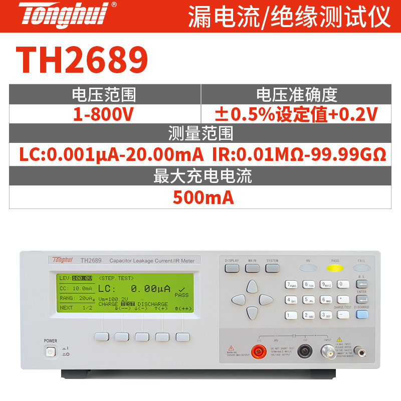 TH2689型電容器漏電流/絕緣電阻測(cè)試儀分別提供最大測(cè)試電壓:800V,充電...