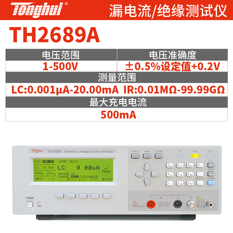 TH2689A型電容器漏電流/絕緣電阻測(cè)試儀分別提供最大測(cè)試電壓:500V,充...