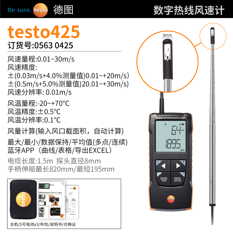 帶有伸縮探頭的熱線風(fēng)速計(jì)testo 425,非常適用于簡(jiǎn)單、快速和精確地測(cè)量空調(diào)...