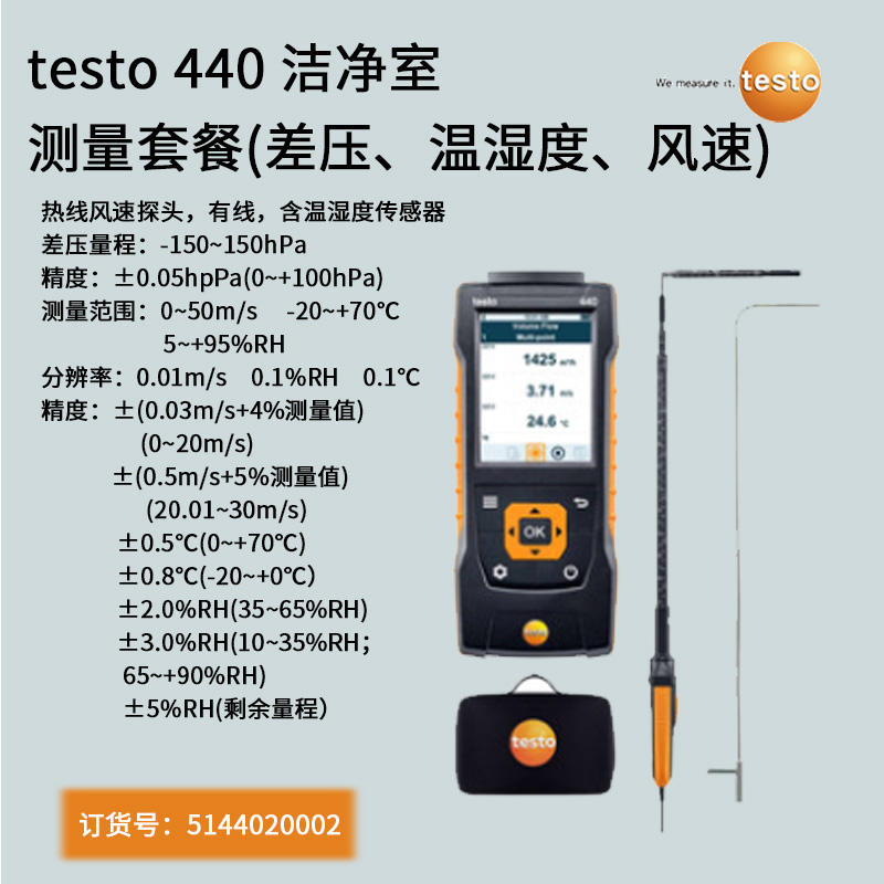 testo 440 潔凈室套裝中主機內置差壓傳感器,通過標配的皮托管可測量室內外...