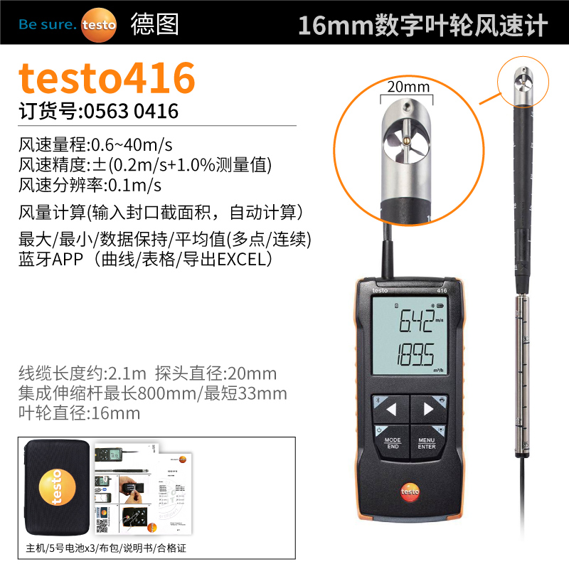 testo 416可連接App的16 mm數字葉輪風速計,帶有伸縮探頭,適用于通風管道...