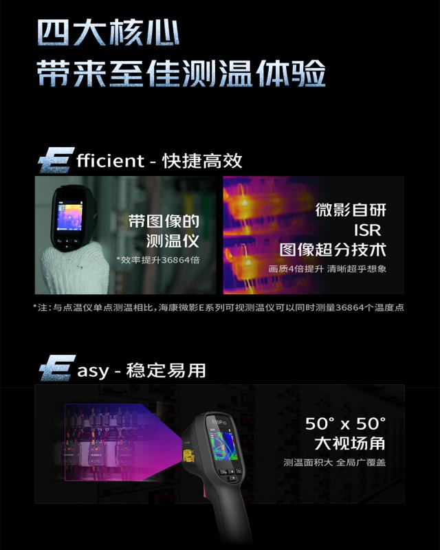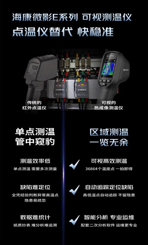 海康熱成像E系列可視測溫儀,小巧輕便,操作簡單。通過可視化面測溫快速判斷熱點位置,精準定位故障同步做好設備預測性維護。點溫儀價格,即可擁有熱像儀體驗。缺陷可視化,測溫視角廣