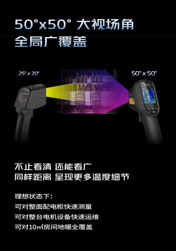 適用于配電柜檢測、電氣巡檢、汽修等場景。熱成像視場角50° x 50° ,輕松覆蓋目標物體