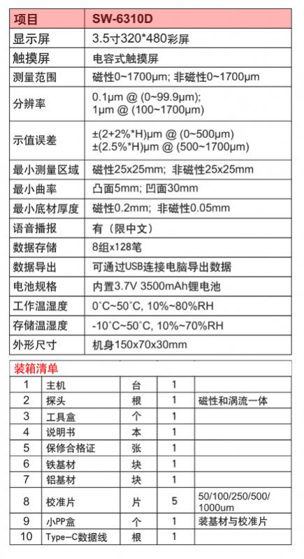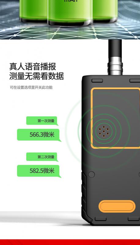 測量范圍:0-1700um,測量誤差:±(2+2%*H)μm @ (0~500μm),±(2.5%*H)um @ (500~1700um)