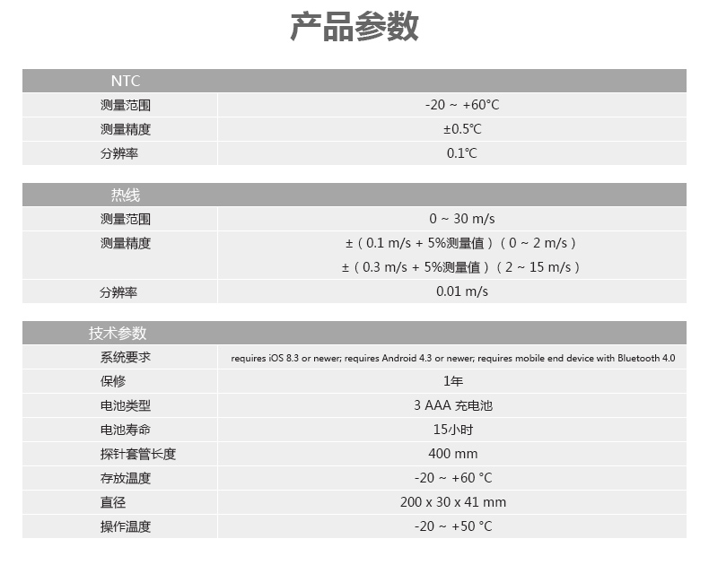 | 測量精度 | ±(0.1 m/s + 5 %測量值) (0 ~ 2 m/s) |