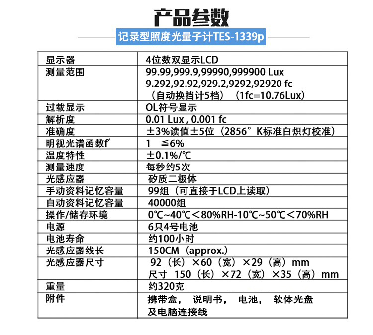 測(cè)量范圍:0.01~999900 Lux(0.001fc~92920fc),解析度:0.01Lux(0.001fc)