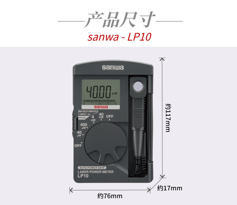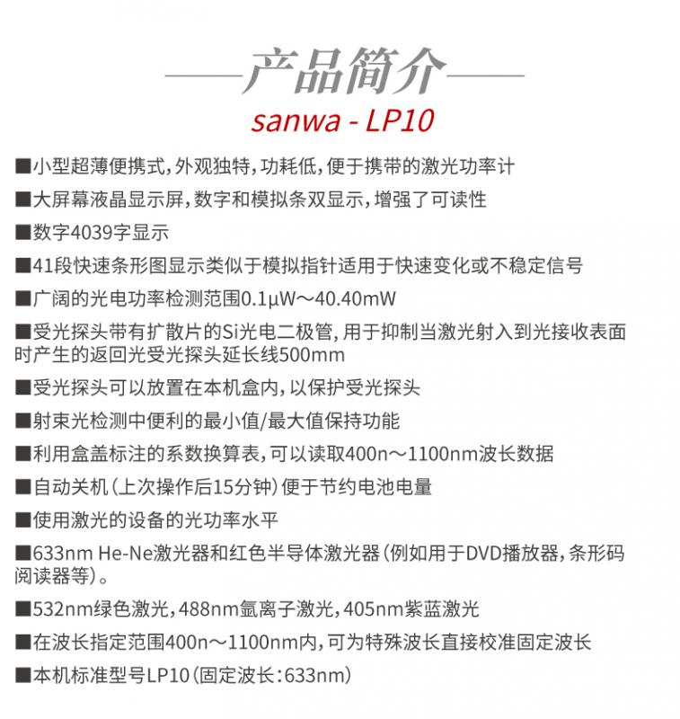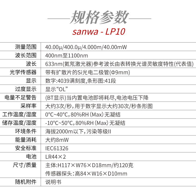 測量范圍:40uW/400uW/ 4mW/ 40mW; 波長范圍:400nm~1100nm ;精度:±5%