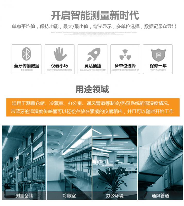 儲存,冷藏和工作場合,通風(fēng)管道以及制冷系統(tǒng)和熱泵的測量,使用濕度/溫度探頭(配備兼容的測量儀)測量相對濕度和空氣溫度。讀數(shù)通過藍(lán)牙直接傳輸?shù)綔y量儀,從而使測量特別方便。