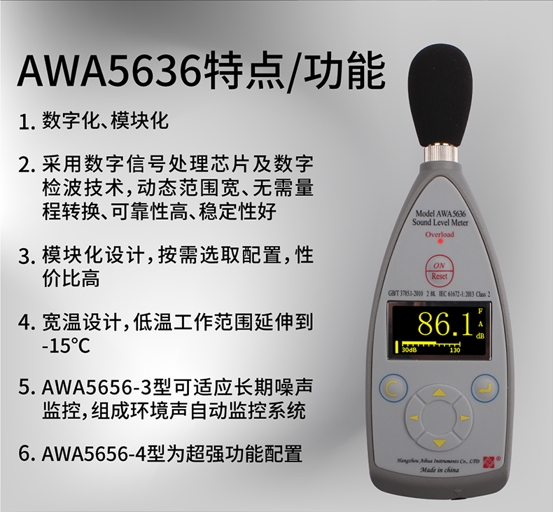 AWA5636型聲級(jí)計(jì)屬于2級(jí)聲級(jí)計(jì),適用于一般噪聲測量。該儀器具有操作、使用簡單,價(jià)格便宜等特點(diǎn),采用數(shù)字化、模塊化設(shè)計(jì)的聲級(jí)計(jì)。