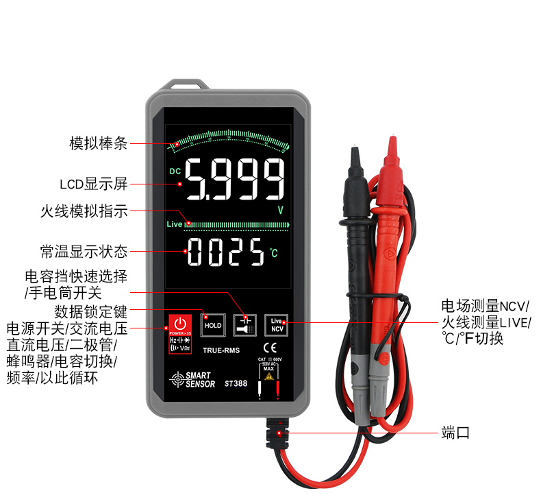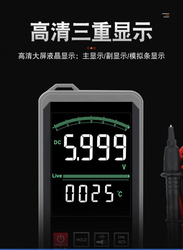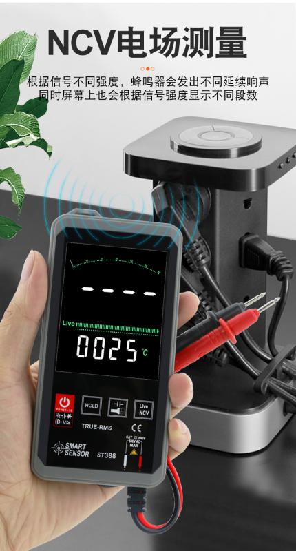 ST388是一款袖珍型3 5/6位口袋型真有效值智能掃描數(shù)字儀表;該系列為三重顯示:主顯示,副顯示,模擬棒條。除交流電壓測量副顯示頻率外,其它功能副顯示為常溫,用戶在使用過程中,真正做到操作不斷電,不需要轉(zhuǎn)動(dòng)撥盤去選擇功能,根據(jù)輸入的 / 的不同會(huì)進(jìn)行自動(dòng)識(shí)別測量,該機(jī)性能 交直流電壓 電阻穩(wěn)定、高精度、高可靠性、讀數(shù)清晰、過載保護(hù)功能。用AAA 1.5V電池驅(qū)動(dòng),該系列儀表采用TA超大彩屏幕LCD 顯示器,采用升壓供電,即使在2.3V低電池邊緣也能保證背光及手電筒的超高亮度,該表攜帶方便,是一款廣大用戶極其喜歡的儀表
